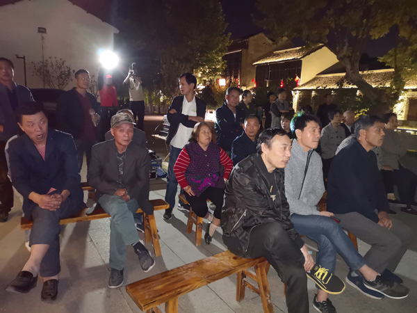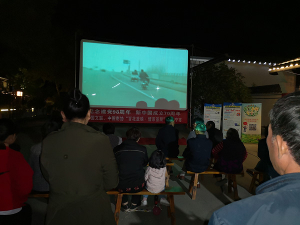 村民们聚集在文化广场观影