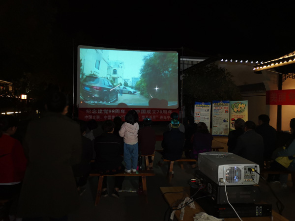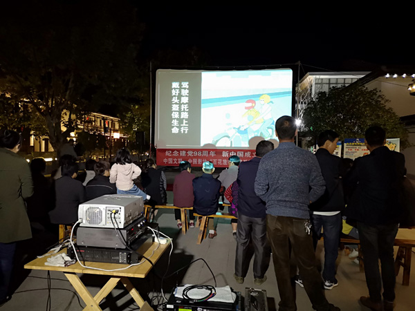 美丽乡村安全行,电影下乡进万村。2019年10月15日,许村镇九斤电影珍藏馆在科同村文化广场为村民放映露天电影,宣传交通安全知识。