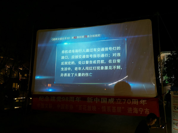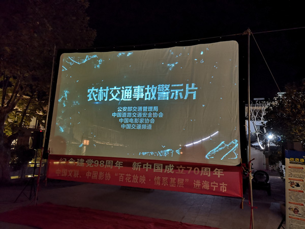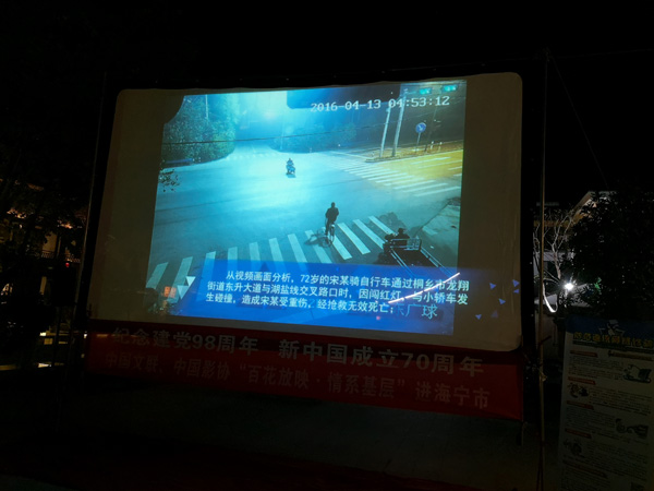 为进一步丰富交通安全宣传内容,创新宣传载体,扩大宣传范围,将道路交通安全法律法规和知识常识送到“田间地头”,海宁公安交警在市“珍爱生命 铁拳护航”交通安全大会战领导小组的大力支持和全市各镇(街道)、村的积极协作下,携手电影放映员,依托“金鸡百花奖电影全国巡回放映”平台,深入开展“美丽乡村安全行 电影下乡进万村”交通安全宣传活动,在全市各村巡回播放《农村交通事故警示片》,以案为鉴、以案说法,扎实推进农村交通安全宣传工作,大力提升农村群众交通安全意识,浓厚文明守法出行氛围,全力筑牢群众出行平安路。