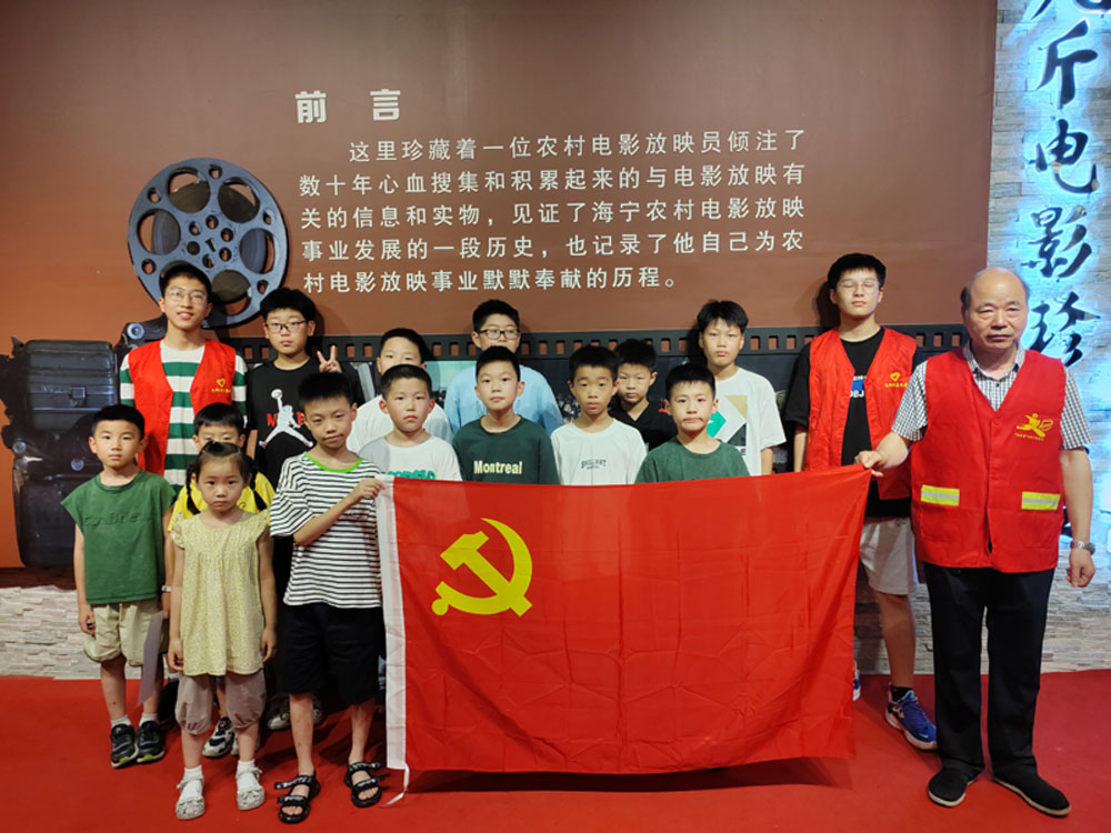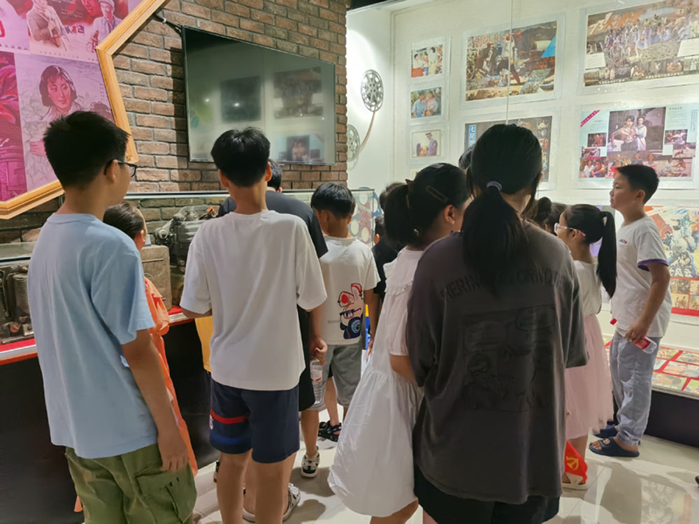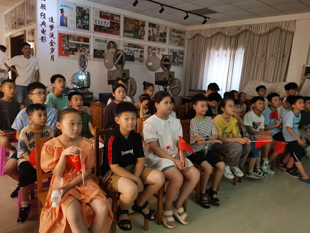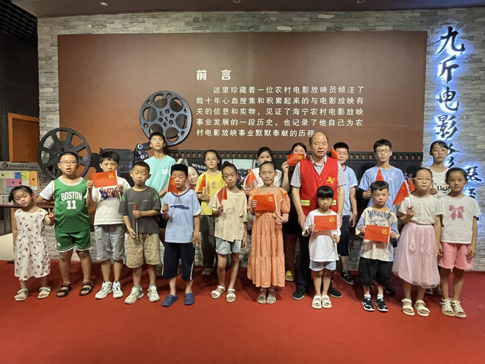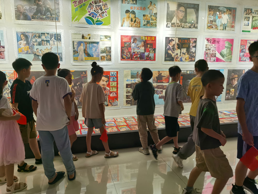 2023年7月27日下午,新华村文桥村开展暑期春泥计划系列活动,传承红色基因活动,重温光辉历史,体悟建党精神,走进海宁市许村镇九斤电影珍藏馆。展厅中陈列的红色经典电影海报和老放映设备让孩子们回顾了共产党的光荣发展历史和曲折前行的光辉历程。徐九斤先生亲自为同学们讲述了电影放映的故事。参观之余,大家在放映厅一起观看了爱国主义电影《地雷战》。