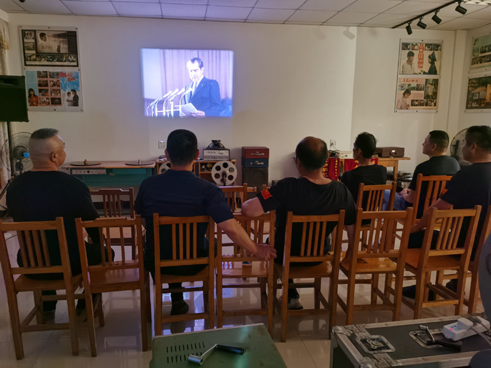 大家在放映厅一起观看纪录电影《周恩来外交风云》