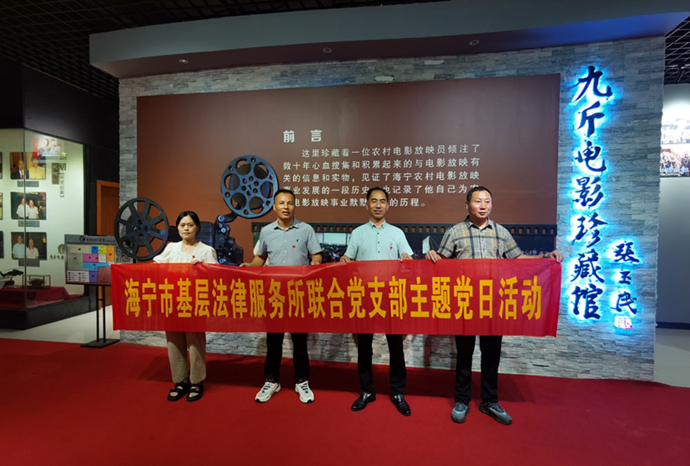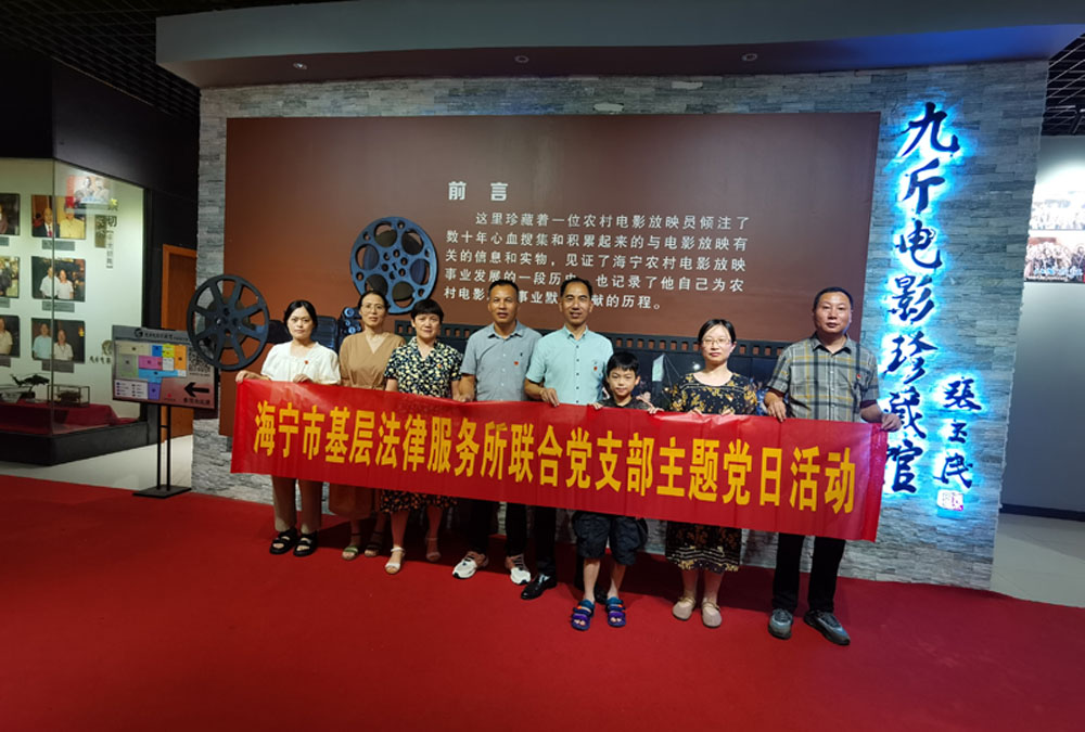 2023年8月10日,海宁市法律服务所联合党支部开展主题党日活动组织参观参观许村九斤电影珍藏馆。一张张经典老电影海报让大家重温了建党峥嵘岁月,参观之余,党员们在珍藏馆放映厅一起观看了纪录片电影《周恩来外交风云》。